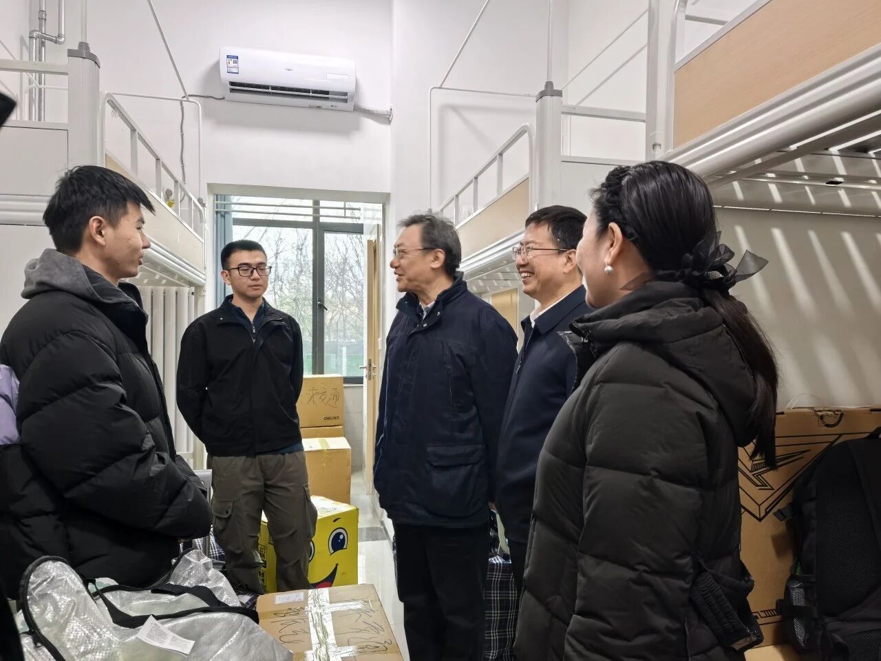 领导与辅导员深入学生宿舍,实地查看新宿舍住宿条件、配套设施,积极协调解决学生在住宿、生活等方面的实际需求。汤颖颖勉励大家要尽快适应,充分依托北校区的资源优势,加强与导师、同学的协作联动,以更快速、更高效的面貌在学术融合与智能交通的科研赛道上聚成一团炽热的火焰。