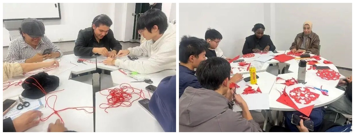 在主题游戏中国结的制作活动环节,同学们于丝绳穿梭的交替节奏中交流编制技巧。这场竞技不仅检验学生对传统绳结工序的熟练度与瞬时判断力,更成为一次以非遗技艺为载体的跨文化表达实践,中英双语同步解说,使几何对称与汉语谐音的东方美学得以在语言转换中被重新编码、共享。