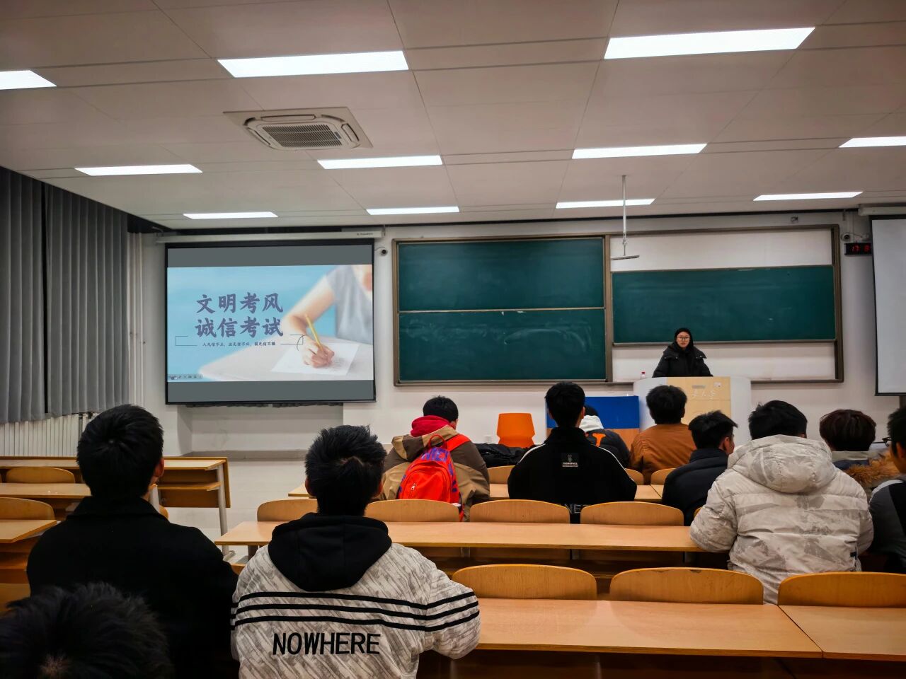 诚信考试教育大会上,各年级辅导员详细讲解期末考试的各项注意事项,包括证件携带、时间遵守、考场秩序维护等关键要求,明确严禁电子产品带入考场等硬性规定。